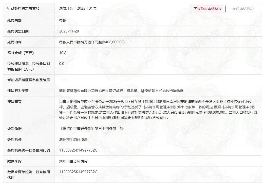 信用中国收录文号为“湖浔环罚〔2025〕31号”的处罚书显示,湖州展望于9月25日在浙江省湖州市南浔区菱湖镇菱湖西庄开发区持排污许可证超标、超总量、逃避监管方式排放污染物。依据《排污许可管理条例》第三十四条第一项,湖州展望被湖州市生态环境局罚款40.8万元。