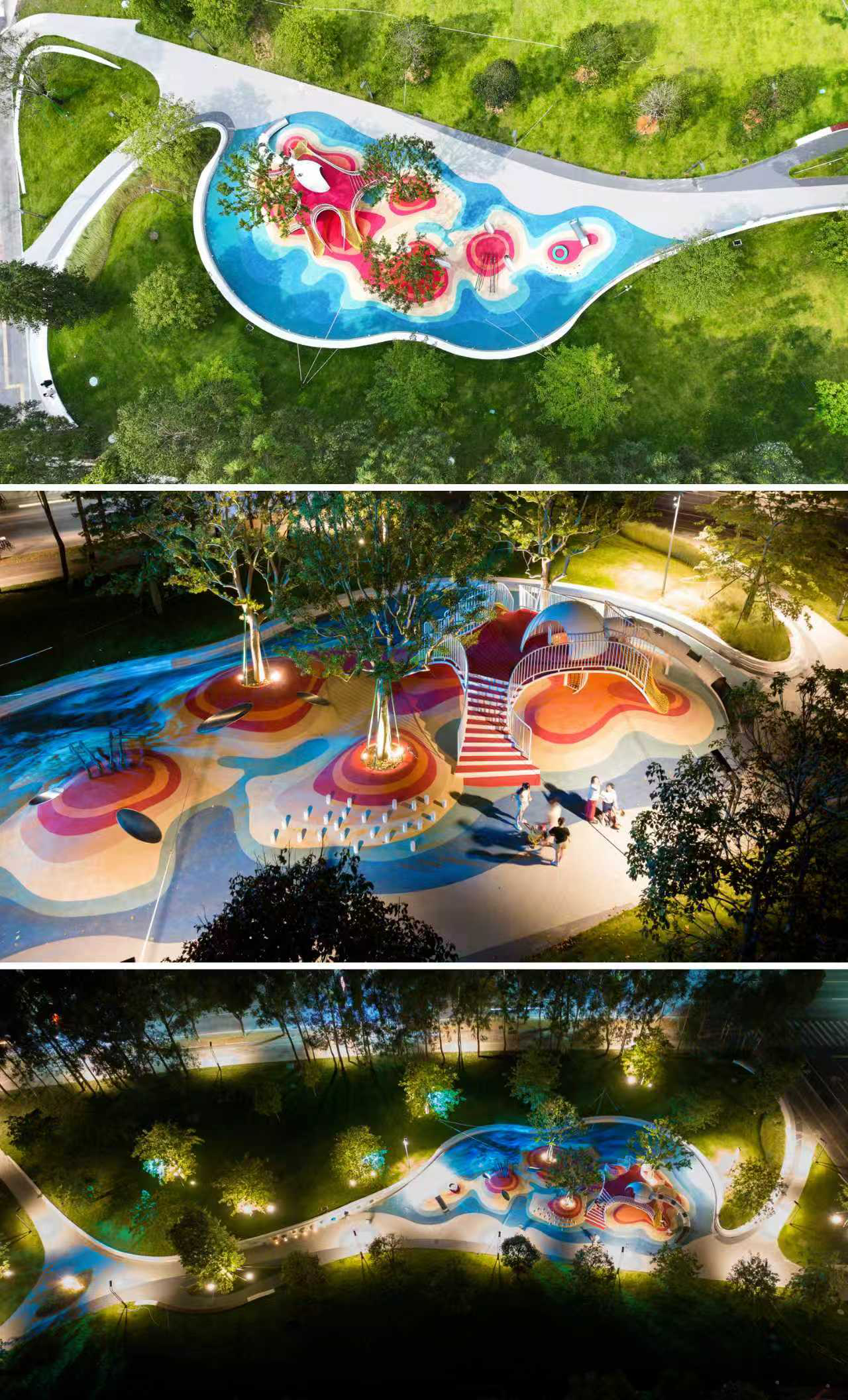 夜晚的它,被灯光晕染得如梦似幻。地面上,蓝、橙、红的色块如地质层般交错,似是把地壳运动的褶皱、沉积的岩层都具象成了孩子脚下的玩乐天地。树木从彩色“地层”中生长而出,树基被环形光带点亮,像极了地质勘探中那些被重点标记的地质点。